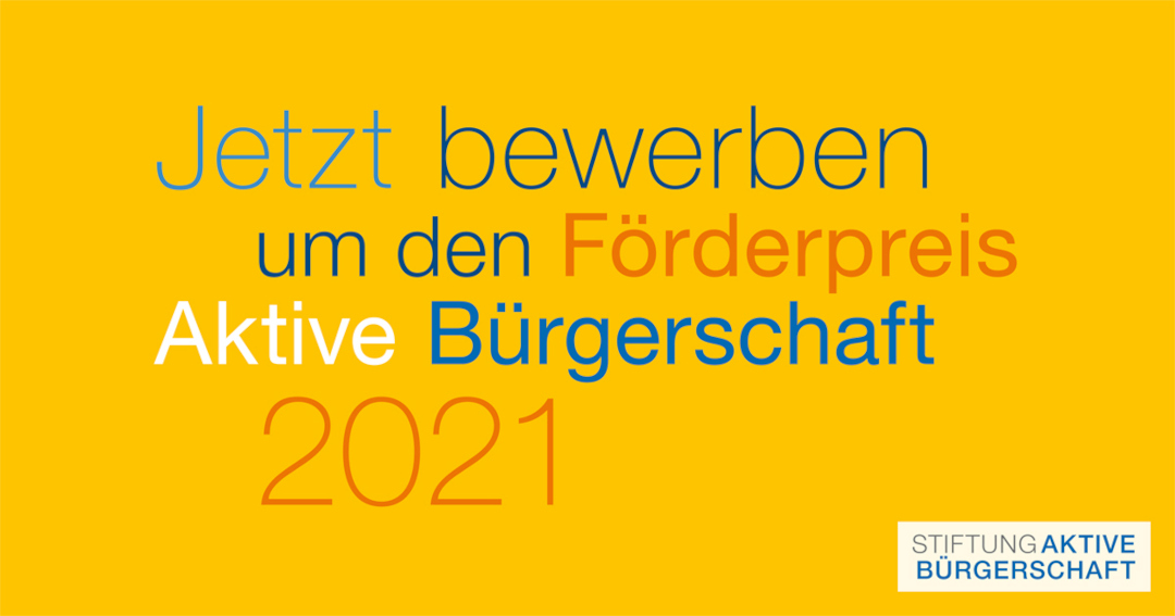 Bürgerstiftungen, Genossenschaftsbanken, Schulen und Journalisten können sich noch bis Ende Oktober für den Förderpreis Aktive Bürgerschaft 2021 bewerben. Mit dem Preis möchte die Stiftung Aktive Bürgerschaft bürgerschaftliches Engagement und die journalistische Beschäftigung mit dem Thema fördern, wertschätzen und zu öffentlicher Aufmerksamkeit verhelfen.