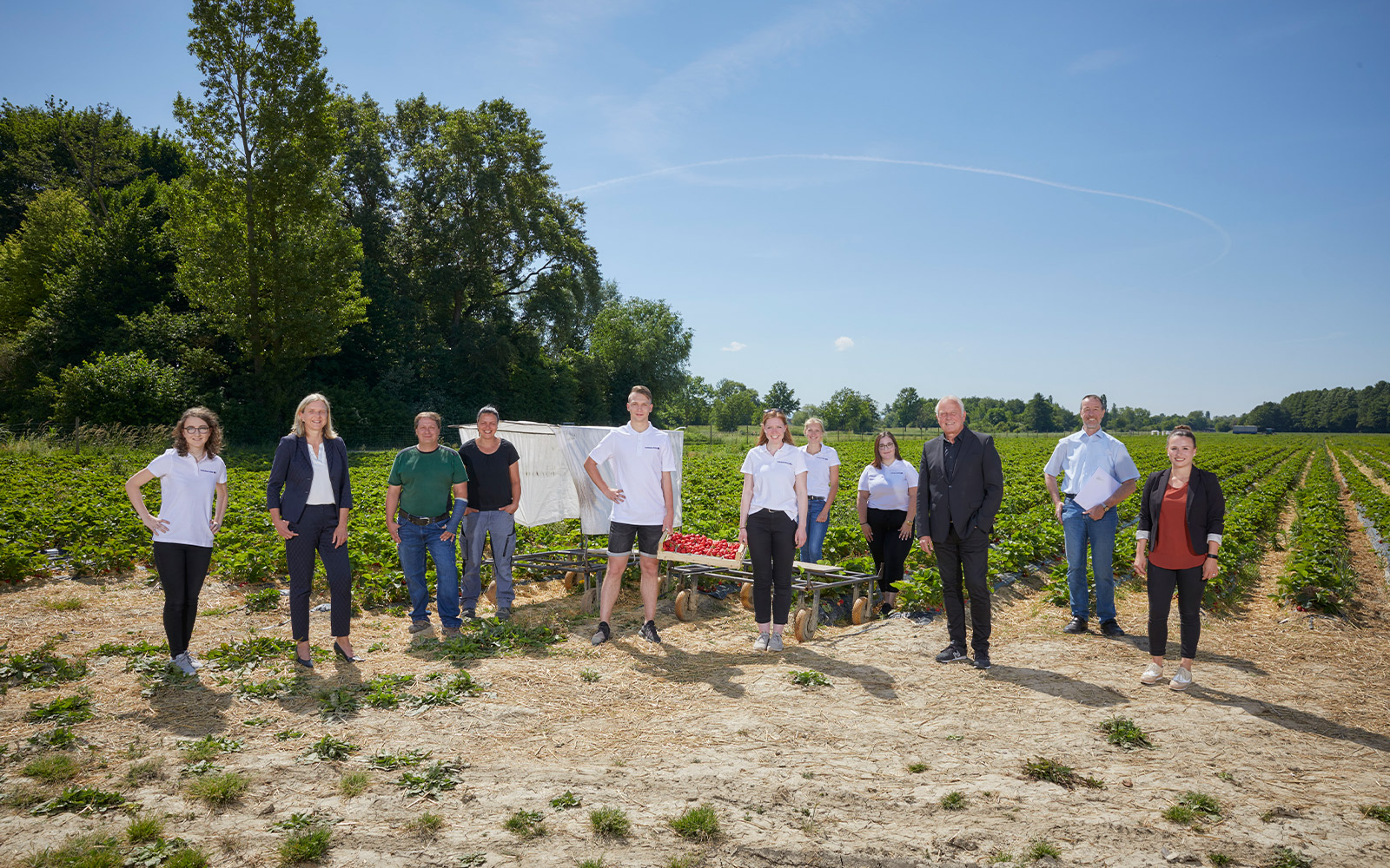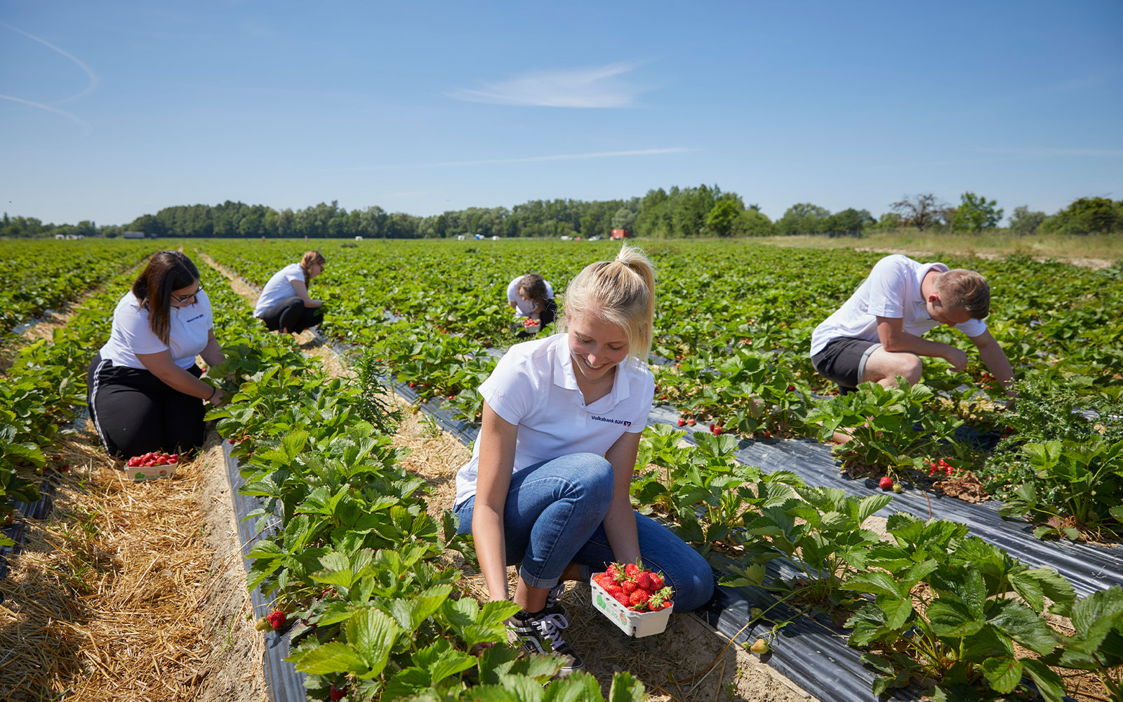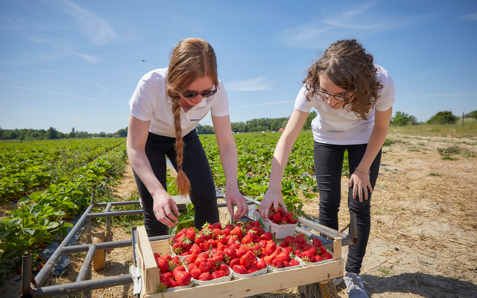 Wer schon einmal Erdbeeren gepflückt hat, weiß, dass das nicht so einfach ist. Entweder kniet man oder hockt sich und nach einiger Zeit wird es ganz schön anstrengend. Umso mehr sind die zwölf Auszubildenden der Volksbank Bühl zu bewundern, die im Mai für jeweils eine Woche ihre Anzüge und Kostüme gegen wetterfeste Kleidung und Gummistiefel tauschten.