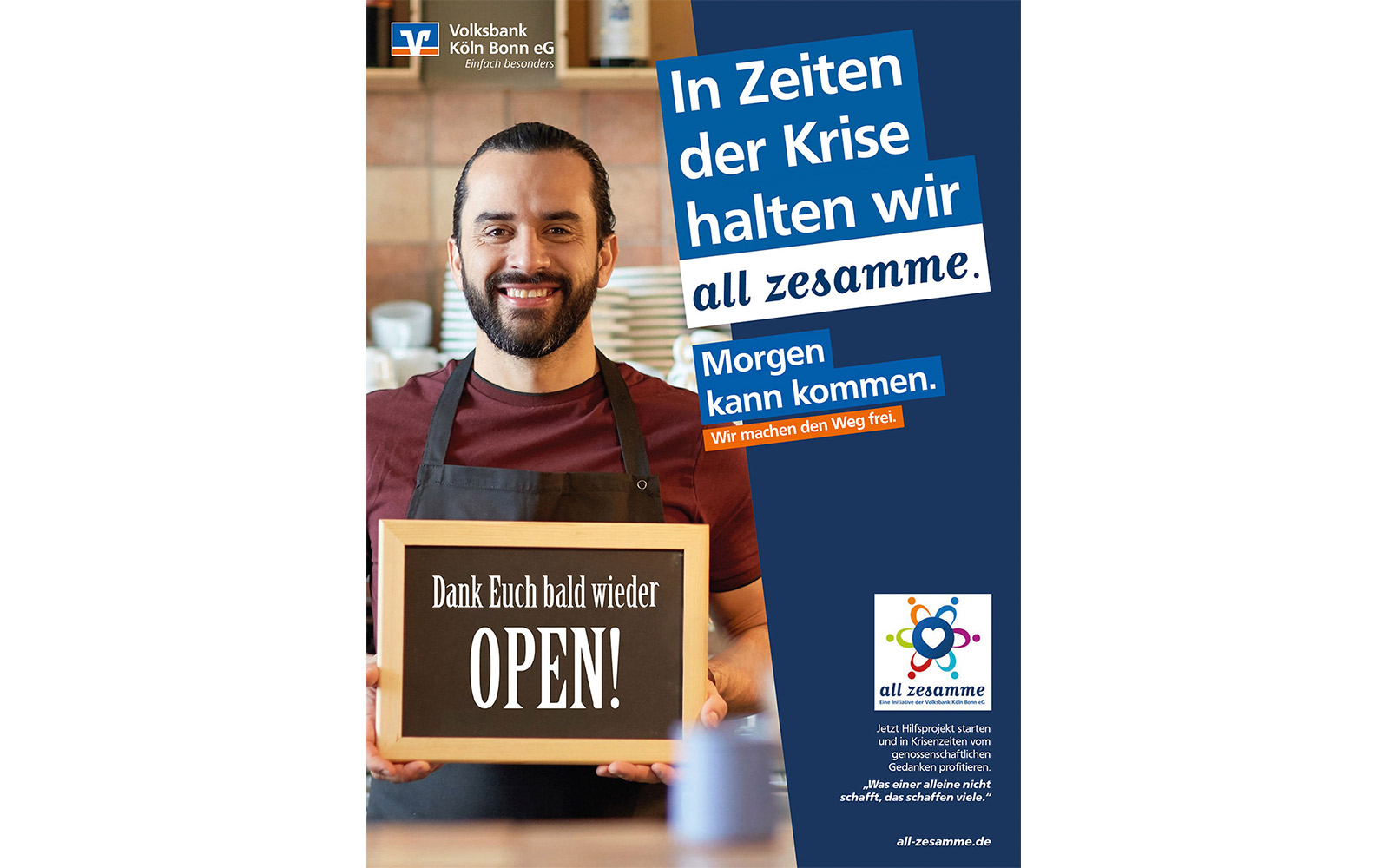 „All zesamme“ heißt die Crowdfunding-Plattform der Volksbank Köln Bonn, die seit sechs Jahren erfolgreich Projekte finanziert. 70 waren es bisher. Die Grundvoraussetzung war bisher immer, dass gemeinnützige Vereine um Unterstützung baten. In der Corona-Krise hat die Bank das Modell spontan erweitert.