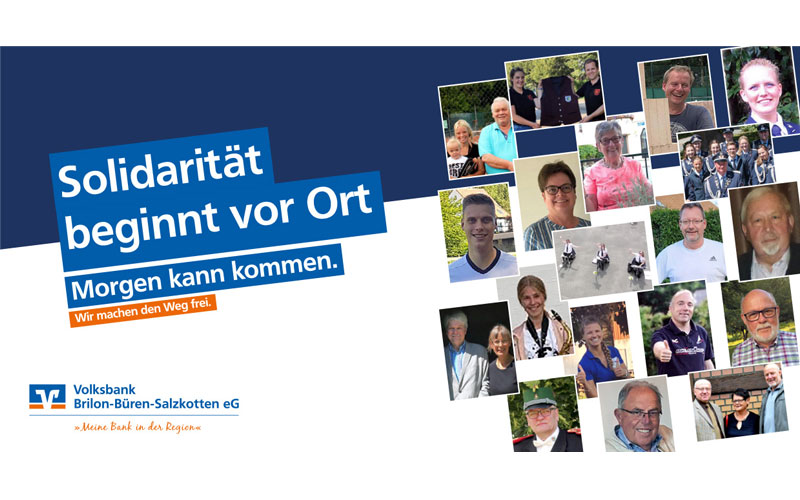 „Solidarität beginnt vor Ort“: Spontane Hilfe für durch die Corona-Pandemie gebeutelte Vereine ermöglichte die Volksbank Brilon-Büren-Salzkotten. Insgesamt 100.000 Euro schüttete das westfälische Institut in nur kurzer Zeit, schnell und unbürokratisch an gemeinnützige Vereine in der Region aus. Um eine Spende zu erhalten, konnten sich diese bei der Volksbank bewerben. Unter sehr vielen Bewerbern entschied sich die Bank innerhalb eines Monats für insgesamt 100 zu fördernde Vereine. Diese erhalten jeweils eine Spende in Höhe von 500 bis 2.500 Euro.