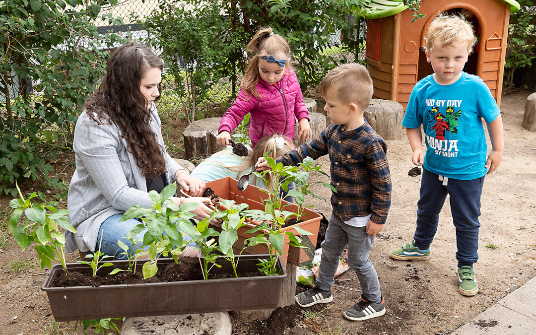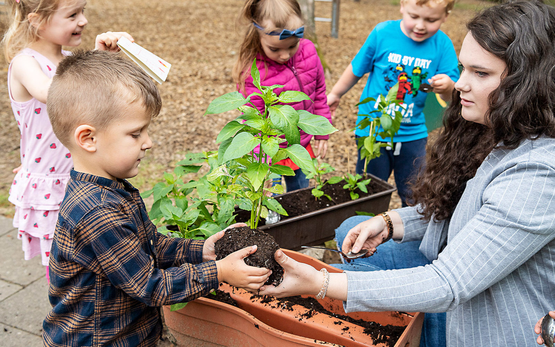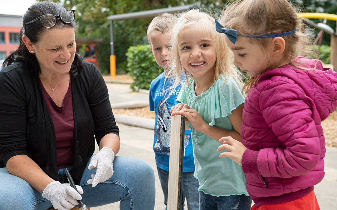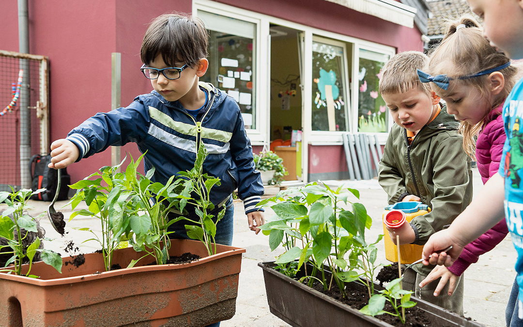 Seit dem Sommer 2020 dürfen die Kinder nun ganz professionell an die Sache herangehen. Im Laufe der Monate bauen sie mit ihren Erzieherinnen Hochbeete, siedeln Setzlinge aus und ernten dann hoffentlich im Herbst viele schmackhafte Dinge. „Für uns ist das ein sehr schönes Projekt, weil die Kinder sich selbst engagieren können“, sagt Judith Jussenhofen. Die Vorsitzende des Fördervereins schaut heute in der Kita zu, wie zwei Erzieherinnen besondere Dinge anleiten und umsetzen. Eine Gruppe Kinder um Kristina Klöpper füllt Blumentöpfe mit Erde und pflanzt selbst gezogene Paprika-Setzlinge ein, während Cornelia Kreft die hellbraunen Bretter für das Hochbeet mit wasserfester Farbe anthrazit lasiert – die Kinder dürfen das noch nicht alleine. Die Kinder sind mit großem Spaß dabei, schippen geduldig Blumenerde in die braunen Behälter, greifen vorsichtig nach den dünnen grünblättrigen Pflanzen und buddeln sie ein. Die anderen reichen ihrer Erzieherin ein Brett nach dem anderen, halten es dort fest, wo noch keine Farbe hingekommen ist und fragen nach, wie genau die Hochbeete später aussehen werden.