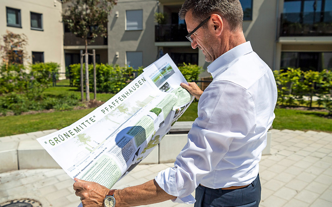 Ebenso schwungvoll wie die Kleinen biegt auch Franz Renftle um die Ecke. Der Bürgermeister der Marktgemeinde fährt, wenn es das Wetter zulässt, gern mit dem Fahrrad, heute will er sich mit Walter Eberhard noch einmal über das Projekt austauschen. Die beiden kennen und schätzen sich, das merkt man sofort. „Für unsere Gemeinde ist die Grüne Mitte aus verschiedenen Gründen ein Glücksgriff“, sagt Renftle, der seit 2017 das Amt innehat. „Schon vor 15 Jahren hat unser damaliger Bürgermeister die Dorferneuerung auf dem Schirm gehabt und mit dem Marktgemeinderat ein städtebauliches Entwicklungskonzept erarbeitet: Wo soll Pfaffenhausen hin, was wollen und was brauchen wir?, hieß es immer.“ Was die Gemeinde benötigt, ist für ihn ganz klar. „Wir wollen das hervorheben, was wir Gutes haben, und gleichzeitig Pfaffenhausen fit für die Zukunft machen – auch wenn es zum Beispiel um den demografischen Wandel in unserem kleinen Zentrum geht.“
