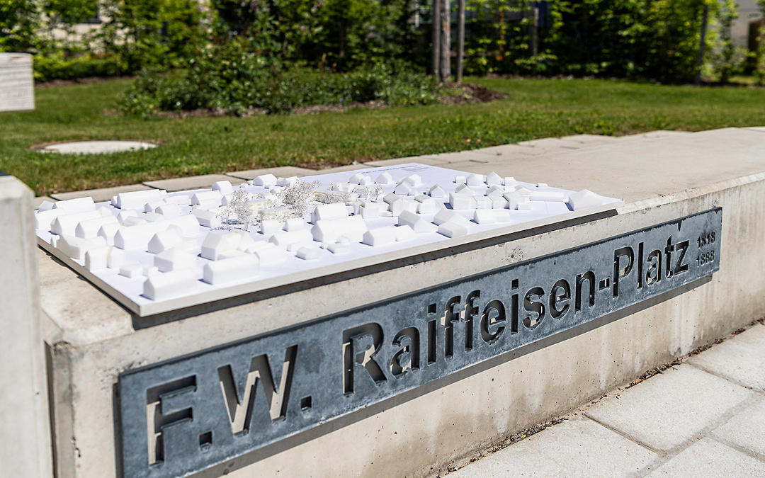 „Wir hatten hier ein Grundstück mit rund 5.300 Quadratmetern, das nicht oder nicht adäquat genutzt wurde“, erinnert sich Walter Eberhard, Vorstandsvorsitzender der Raiffeisenbank Pfaffenhausen. Auf dem Gelände gab es zwei alte renovierungsbedürftige Häuser, eine Wiese und ein aufgelassenes Lagerhaus mit einer unansehnlichen Kiesfläche davor. Heute sieht der Platz ganz anders aus: Er ist mit hellen Steinen belegt, die Sonne strahlt über die mit Holz bedeckten Sitzgelegenheiten. Die modernen Wohngebäude haben große Fenster, in den Vorgärten wird Rasen gemäht. Und wie um die Idylle zu vervollständigen, kommen zwei Mütter mit ihren kleinen Kindern kurz vor dem Mittagessen vorbei, damit diese auf dem ebenfalls neu geschaffenen F.-W.-Raiffeisen-Platz mit Wasserspiel im Zentrum der Anlage mit dem Bobbycar herumsausen können.