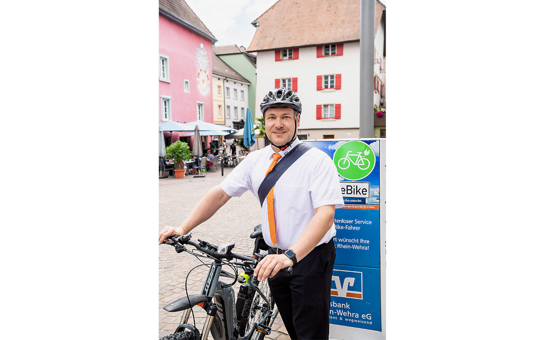Doch das Engagement der Bank geht noch weiter: Immer mehr Touristen fahren weite Strecken mit dem E-Bike und machen auch in der beschaulichen Innenstadt von Bad Säckingen Halt. „Wir haben direkt vor unserer Bankzentrale eine E-Bike-Tankstelle eingerichtet“, erzählt Thomann. „So können die Fahrradfahrer, die auf dem internationalen Rhein-Radweg zum Beispiel vom Bodensee nach Basel fahren, gleichzeitig hier bei uns ihre Fahrräder auftanken, während sie im Café nebenan einen Cappuccino trinken. Das macht die Innenstadt noch attraktiver.“