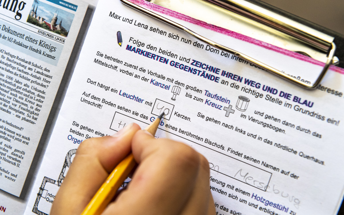 Heute nimmt Beate Tippelt, die für das Besucherprogramm in Merseburg verantwortlich ist, eine Gruppe Mädchen mit auf die Reise in die Vergangenheit, die unter dem Projektnamen „Maß und Zahl“ in beiden Domen angeboten wird. „Am Anfang gehen wir erst einmal durch den Dom, dessen Besonderheiten die Kinder entdecken sollen. Die große Orgel aus dem 17. Jahrhundert zum Beispiel, die alte Grabplatte von Bischof Thietmar, das Portal zur Fürstengruft, die Krypta“, erklärt die Expertin, die sich seit mehr als 30 Jahren hier engagiert und deren Eltern schon durch den Dom geführt haben. Lena, Alicia, Ella und Lucy, so heißen die vier Zwölfjährigen, folgen dabei einem Anleitungsheftchen, in dem sie ihre Erkenntnisse eintragen.