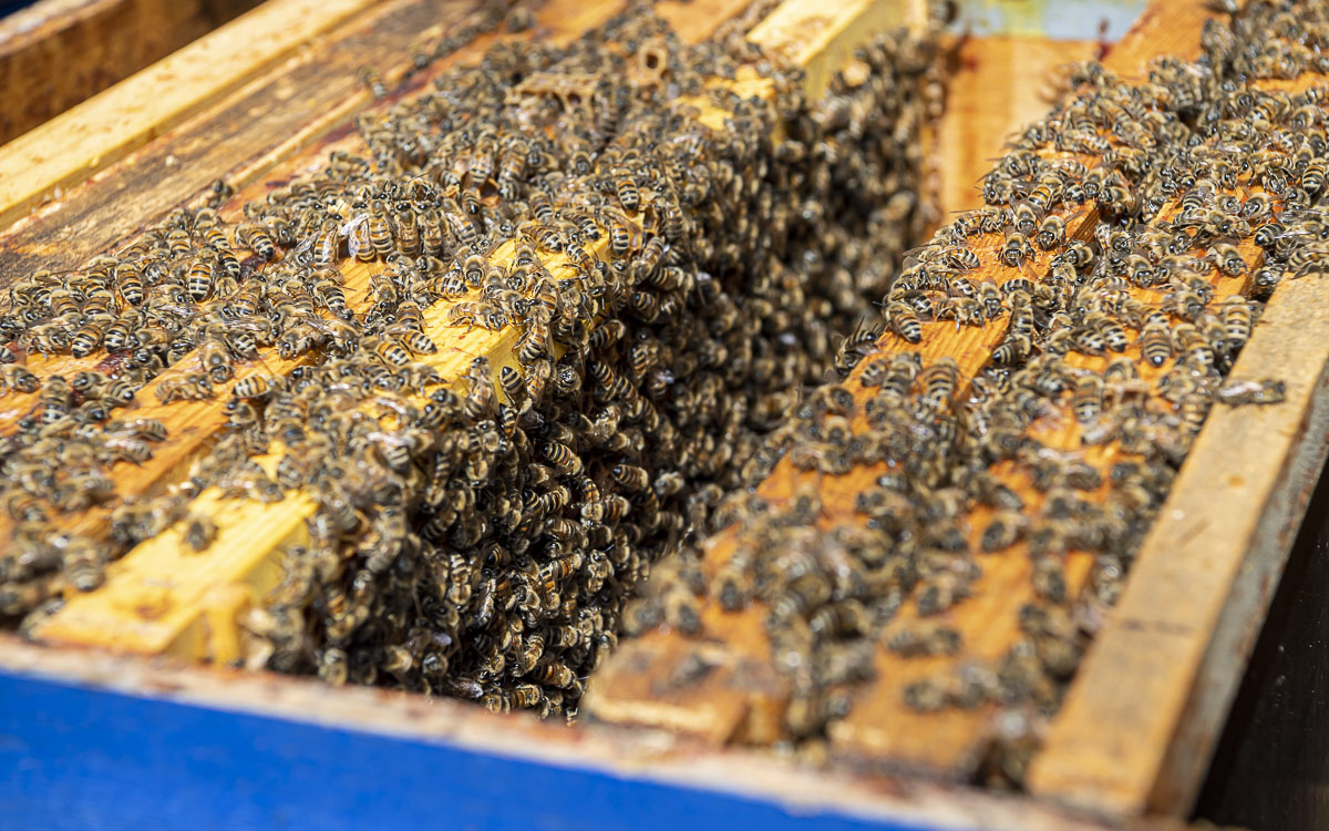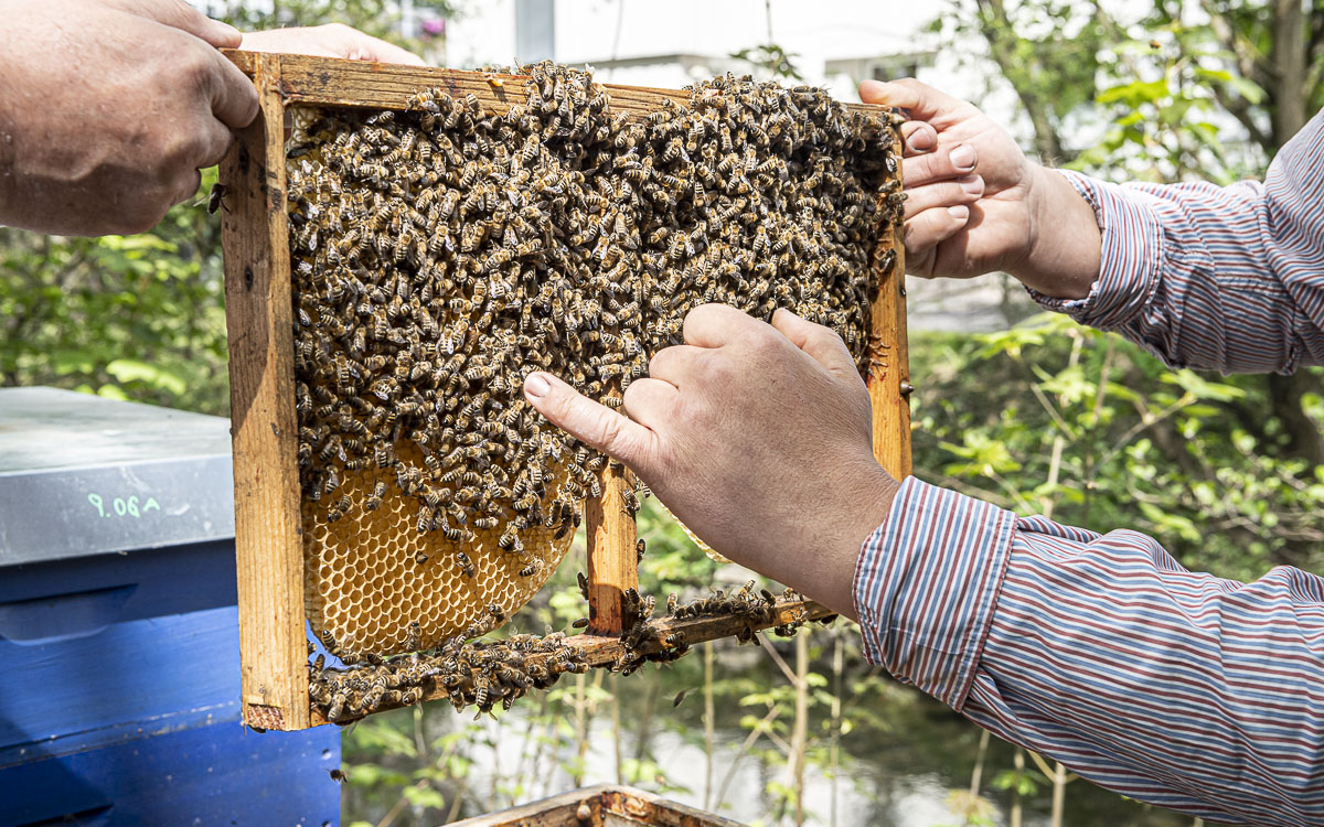 Für Sebastian Klein und Heiko Neumann ist dieses Vorgehen genau richtig. Die beiden Imker, die sich bei einem Projekt zur Solidarischen Landwirtschaft kennenlernten, sind mit ihren ursprünglichen Berufen gar nicht so weit von der Bank entfernt. Heiko Neumann war Bankkaufmann, Coach und in der Schuldnerberatung tätig, Sebastian Klein war Grafikdesigner und Marketingberater. „Wir haben uns irgendwann umorientiert, um viel fokussierter etwas zu tun, was Ökologie und Ökonomie vereint“, sagt Heiko Neumann. Beide imkern schon seit Jahren, mit Herz und Leidenschaft. „Wenn wir die Bienenvölker beobachten, nehmen wir unsere gesamte Umwelt besser wahr und verstehen die Regeln der Natur.“ Die Insekten haben auch eine große wirtschaftliche Bedeutung. Die über 2.000 heimischen Nutz- und Wildpflanzenarten sind zu über 80 Prozent auf die Bestäubungsleistung der Bienen angewiesen. „Die Biene ist das drittwichtigste Nutztier in der Landwirtschaft und leistet daneben auch wichtige Pionierarbeit etwa auf Flächen, die rekultiviert werden sollen“, sagt Neumann.