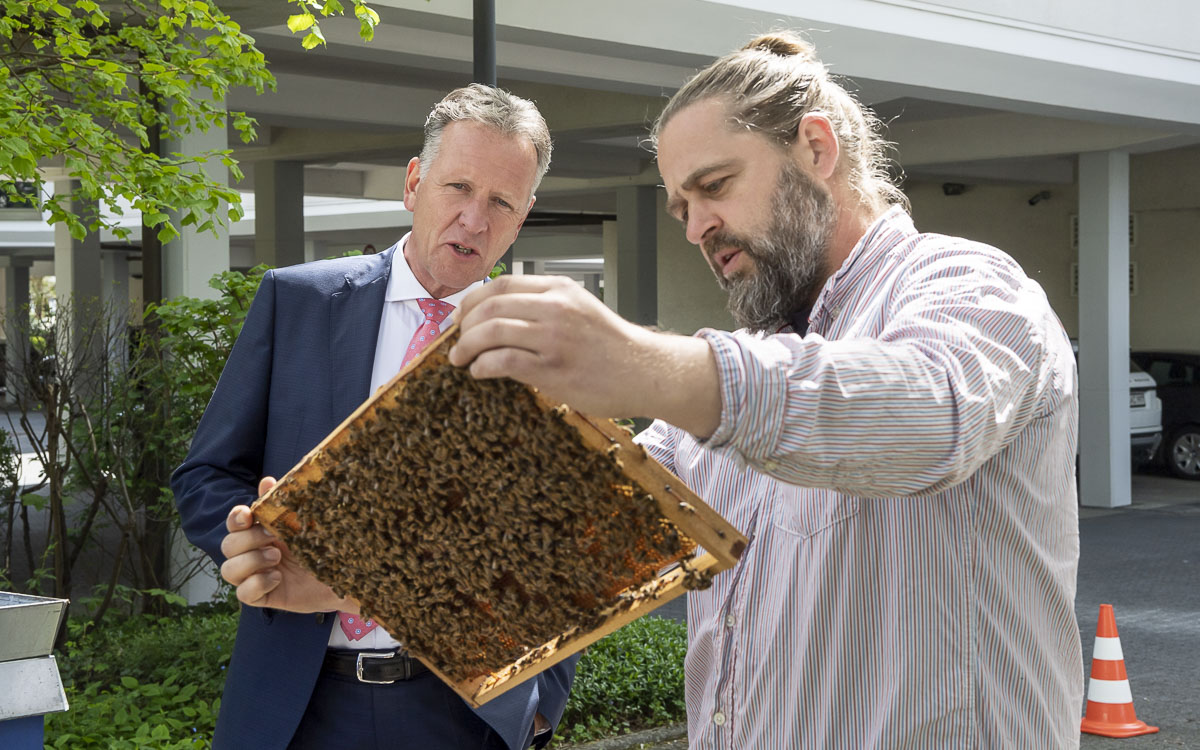 Neugierig schaut ihm Ingo Stockhausen dabei zu. Der Vorstandsvorsitzende der Volksbank Oberberg hat mit Sebastian Klein und dessen Kollegen Heiko Neumann seit zwei Jahren zu tun. Die beiden Imker vermieten der Bank mit ihrer Firma PlanBee zehn Bienenstöcke mit insgesamt 500.000 Bienen, die über das Geschäftsgebiet verteilt in Gärten von Bankmitarbeiterinnen und -mitarbeitern stehen. Sie kümmern sich zudem um die Pflege der Bienen und auch um die Produktion des Honigs.