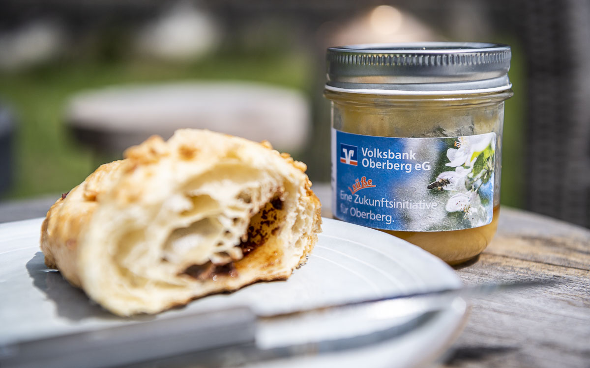 Die Bienenstöcke unterstreichen ebenfalls das Engagement der Bank für Naturschutz und Biodiversität. „Bienen gehören zur Region und zu unserem Leben dazu, erst recht hier, wo wir ja sehr ländlich, kleinstädtisch geprägt sind“, macht Ingo Stockhausen klar. „Neben der Ökologie haben wir aber auch einen ökonomischen Nutzen: Wir brauchen Bienen, um unsere Obstwiesen hier zu bestäuben.“ Einen weiteren Vorteil nennt der Bankvorstand dann noch ganz am Rande: „Wir verschenken jedes Jahr die rund 200 Kilogramm Ernte und machen damit Menschen eine große Freude.“ Im ersten Jahr profitierten über 70 oberbergische Kindertagesstätten, Kindergärten und Grundschulen von der süßen und gleichzeitig gesunden Überraschung, 2020 dann die Tafeln im Geschäftsgebiet, die Bedürftige mit Essensspenden versorgen.